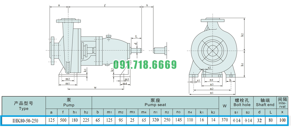 Kích thước của đầu máy bơm nước li tâm cánh hở IHK80-50-250 hiệu suất 13-60 m3/h