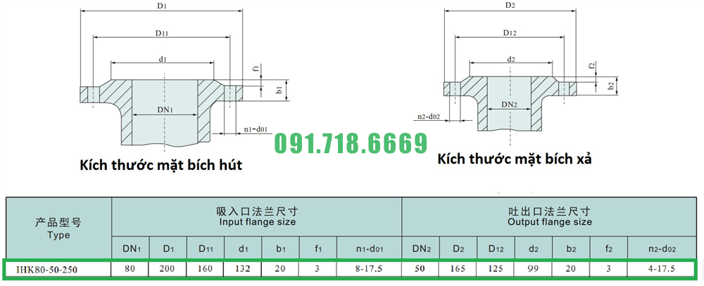Kích thước mặt bích của máy bơm nước li tâm cánh hở IHK80-50-250 hiệu suất 13-60 m3/h