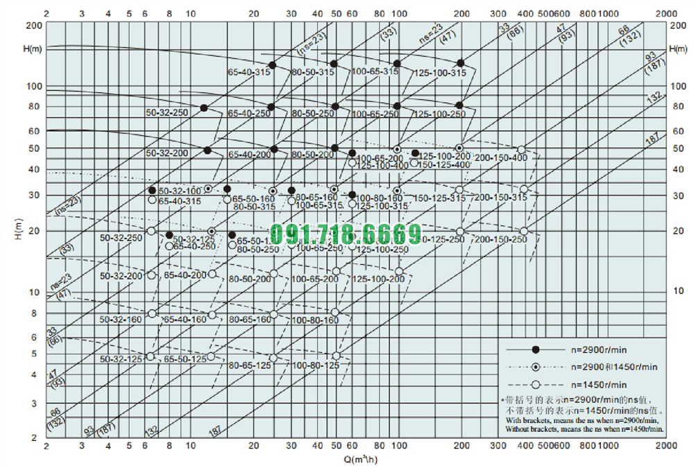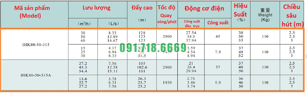Bảng lưu lượng của máy bơm nước sạch li tâm cánh hở IHK80-50-315