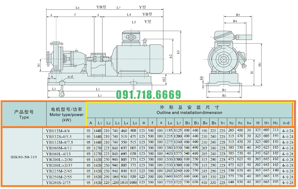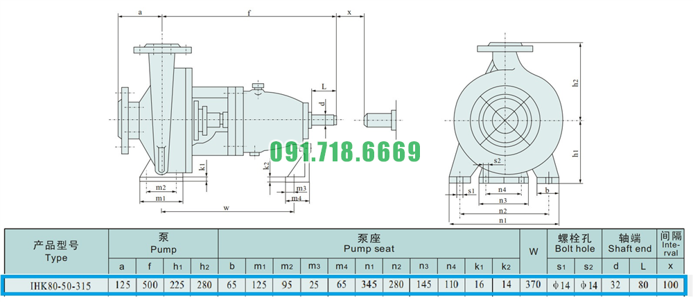 Kích thước của đầu máy bơm nước sạch li tâm cánh hở IHK80-50-315