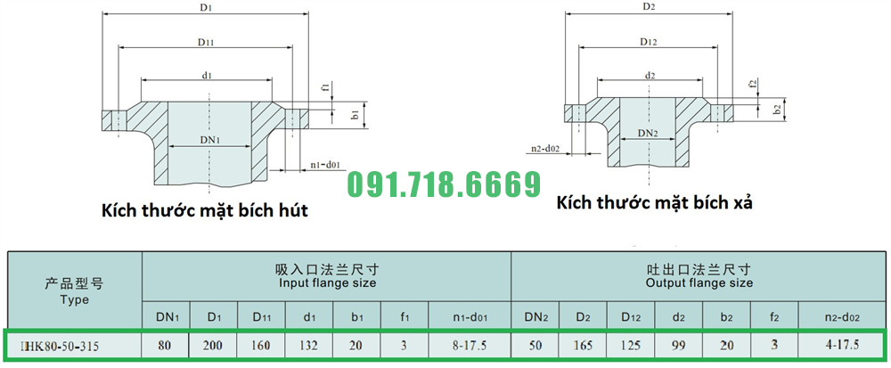 Kích thước mặt bích của máy bơm nước sạch li tâm cánh hở IHK80-50-315