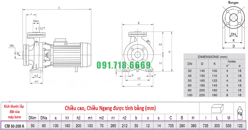 Kích thước máy bơm nước sạch li tâm CM50-250C đường thoát 40 mm