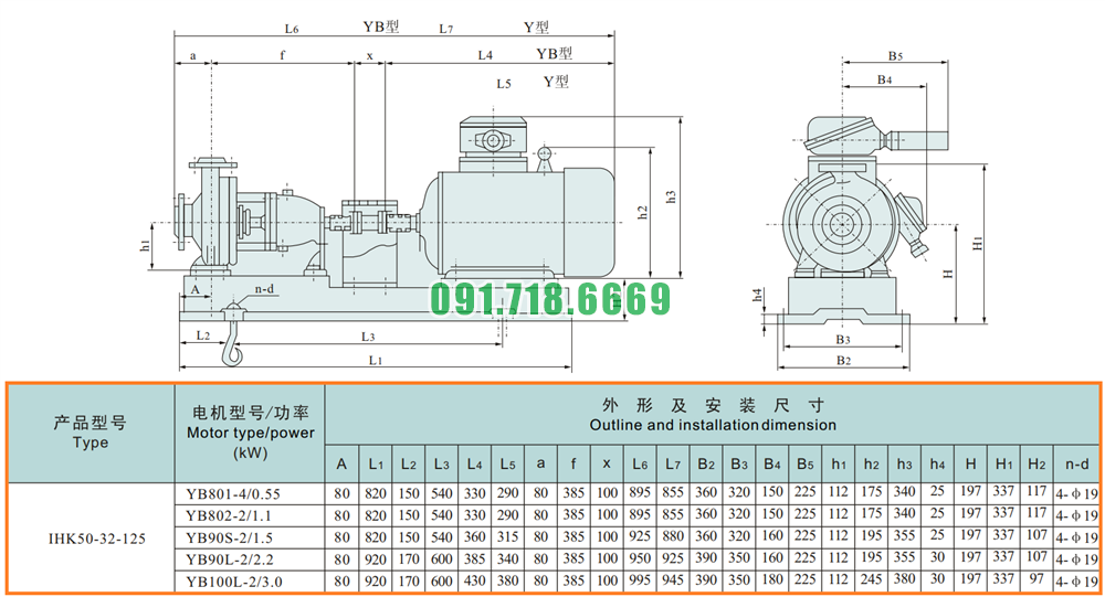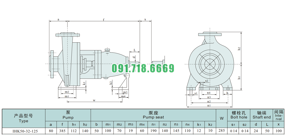 Kích thước lắp đặt của đầu bơm bơm li tâm cánh hở đường thoát đầu vào ra Dn100 model IHK50-32-125