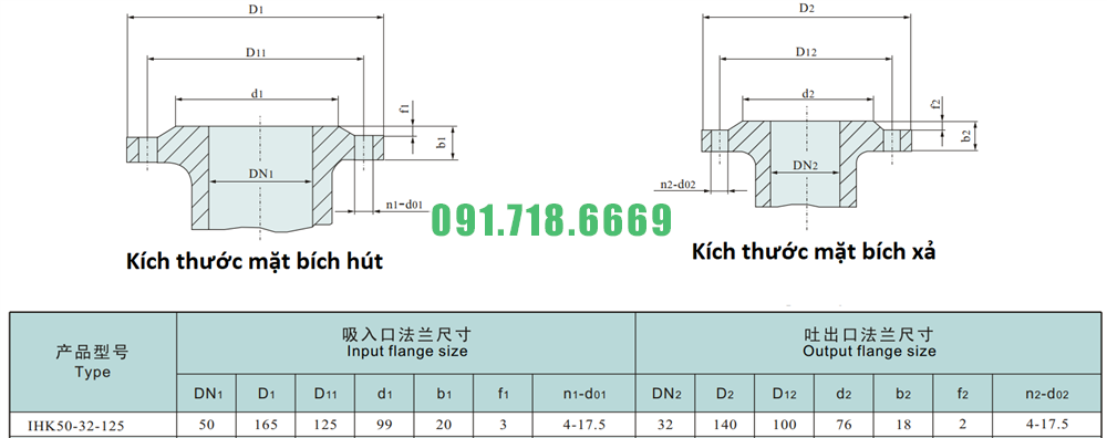 Kích thước mặt bích kết nối hút xả của bơm li tâm cánh hở đường thoát đầu vào ra Dn100 model IHK50-32-125