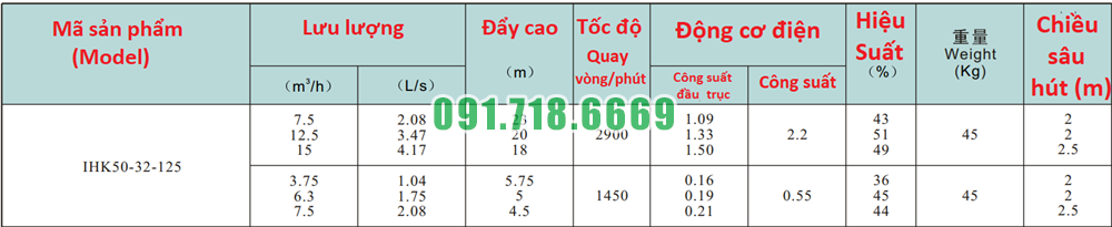Bảng thông số lưu lượng của bơm li tâm cánh hở đường thoát đầu vào ra Dn100 model IHK50-32-125