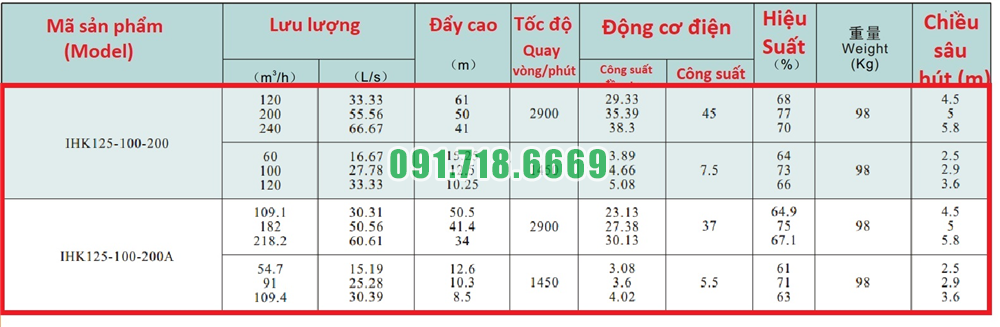 Bảng lưu lượng của bơm li tâm cánh hở đường thoát đầu vào ra Dn125 model IHK125-100-200