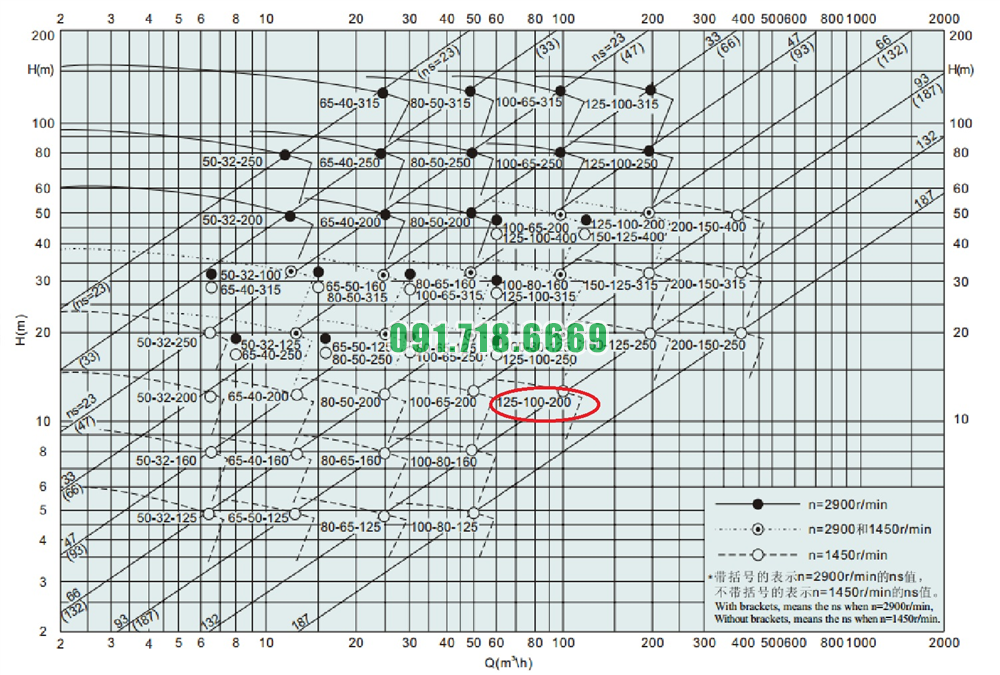 Đường cong hiệu suất của bơm li tâm cánh hở đường thoát đầu vào ra Dn125 model IHK125-100-200