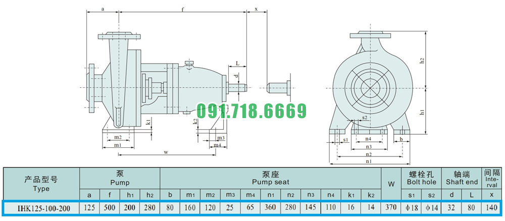 Kích thước của đầu bơm li tâm cánh hở đường thoát đầu vào ra Dn125 model IHK125-100-200