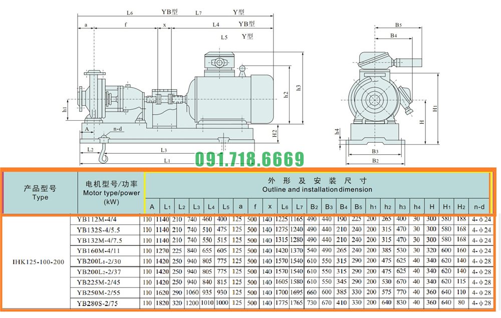 Kích thước lắp đặt của bơm li tâm cánh hở đường thoát đầu vào ra Dn125 model IHK125-100-200