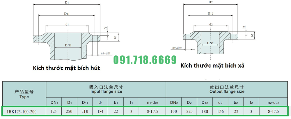 Kích thước mặt bích của bơm li tâm cánh hở đường thoát đầu vào ra Dn125 model IHK125-100-200
