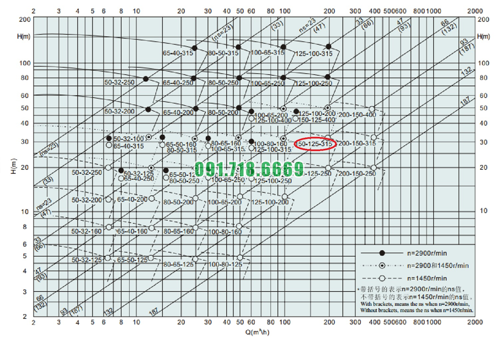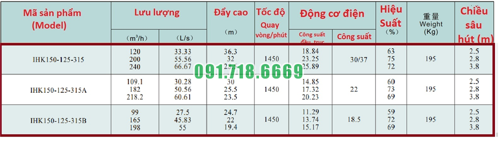 Bảng lưu lượng của bơm li tâm cánh hở đường thoát đầu vào ra Dn150 model IHK150-125-315