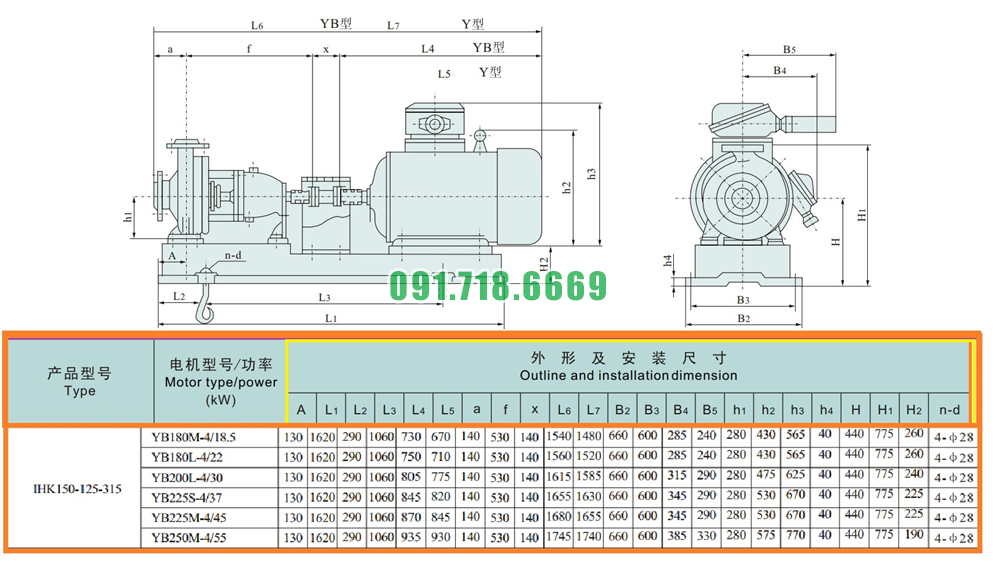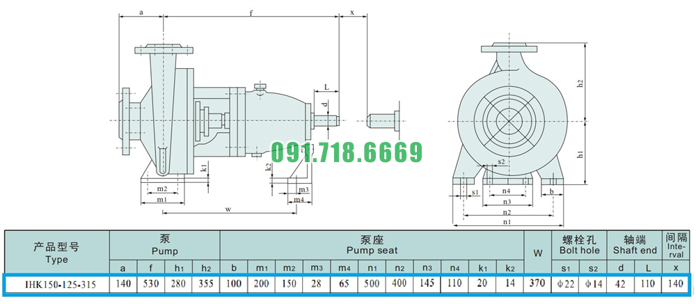 Kích thước của đầu bơm li tâm cánh hở đường thoát đầu vào ra Dn150 model IHK150-125-315