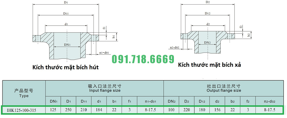 Kích thước mặt bích của bơm li tâm cánh hở đường thoát đầu vào ra Dn150 model IHK150-125-315
