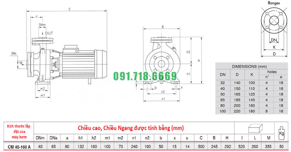 Thông số kỹ thuật bơm li tâm trục ngang đường thoát đầu vào ra Dn65 model CM40-160A