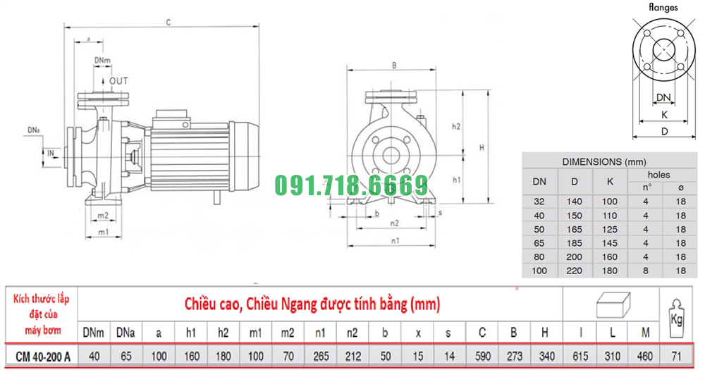 Kích thước bơm li tâm trục ngang đường thoát đầu vào ra Dn65 model CM40-200A