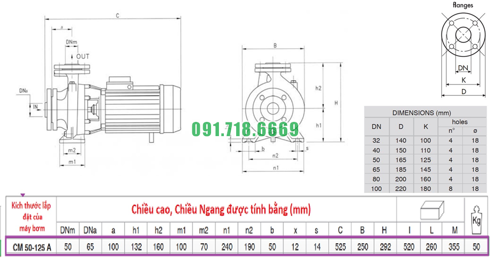 Kích thước bơm li tâm trục ngang đường thoát đầu vào ra Dn65 model CM50-125A
