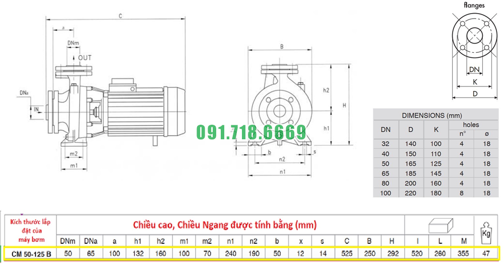 Thông số kỹ thuật bơm li tâm trục ngang đường thoát đầu vào ra Dn65 model CM50-125B