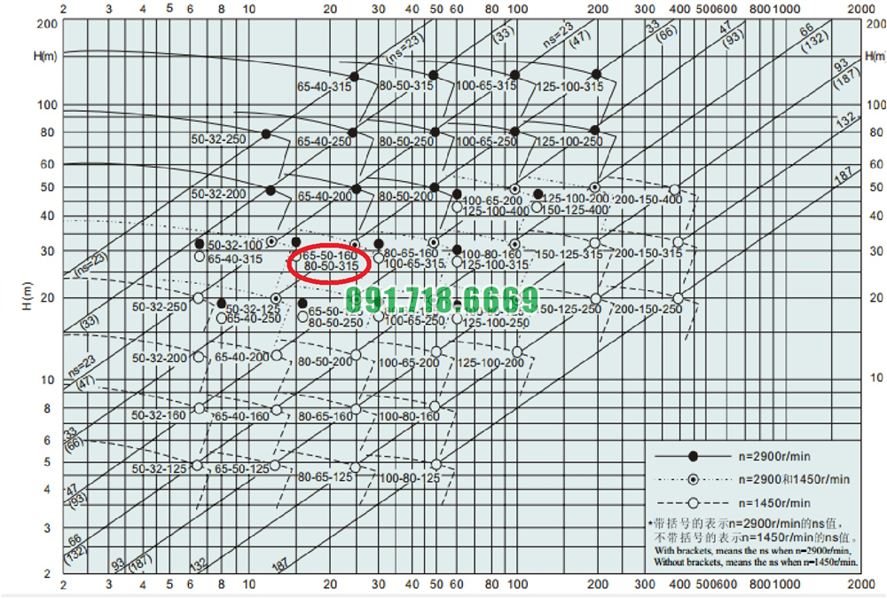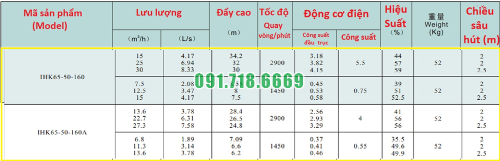 Bảng lưu lượng của máy bơm cánh hở li tâm trục ngang IHK65-50-160 inox 316