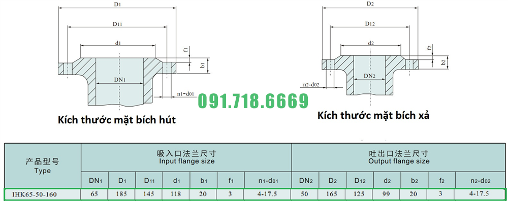 Kích thước mặt bích của máy bơm cánh hở li tâm trục ngang IHK65-50-160 inox 316