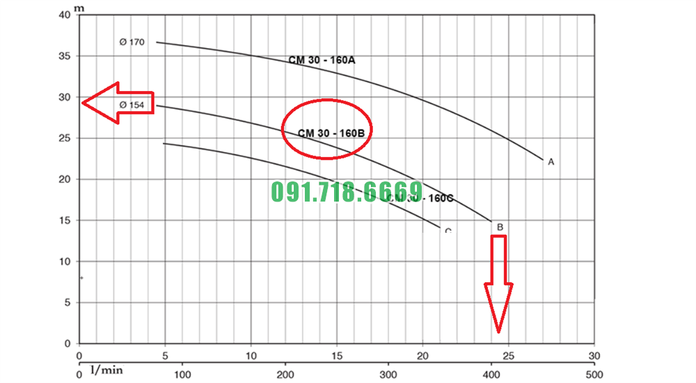 Đường cong hiệu suất máy bơm nước sạch li tâm trục ngang CM32-200C kích thước 32 mm