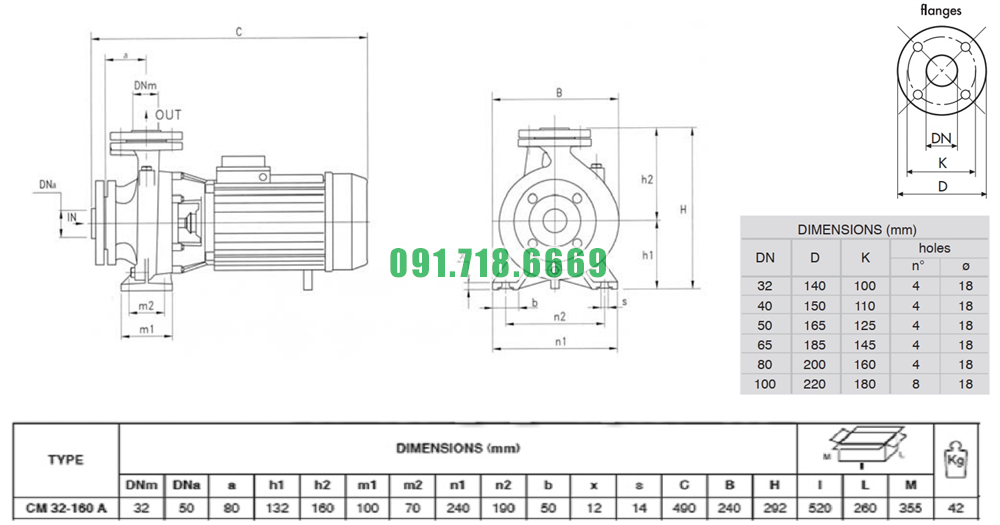 Kích thước máy bơm nước sạch li tâm trục ngang CM32-200C kích thước 32 mm