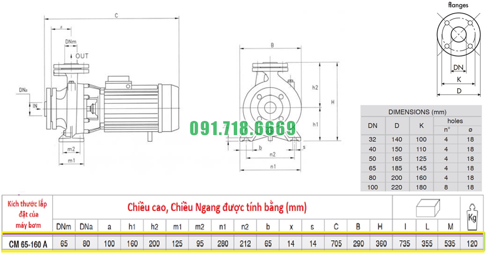 Kích thước máy bơm nước sạch li tâm trục ngang CM65-160A lưu lượng 144 m3/h