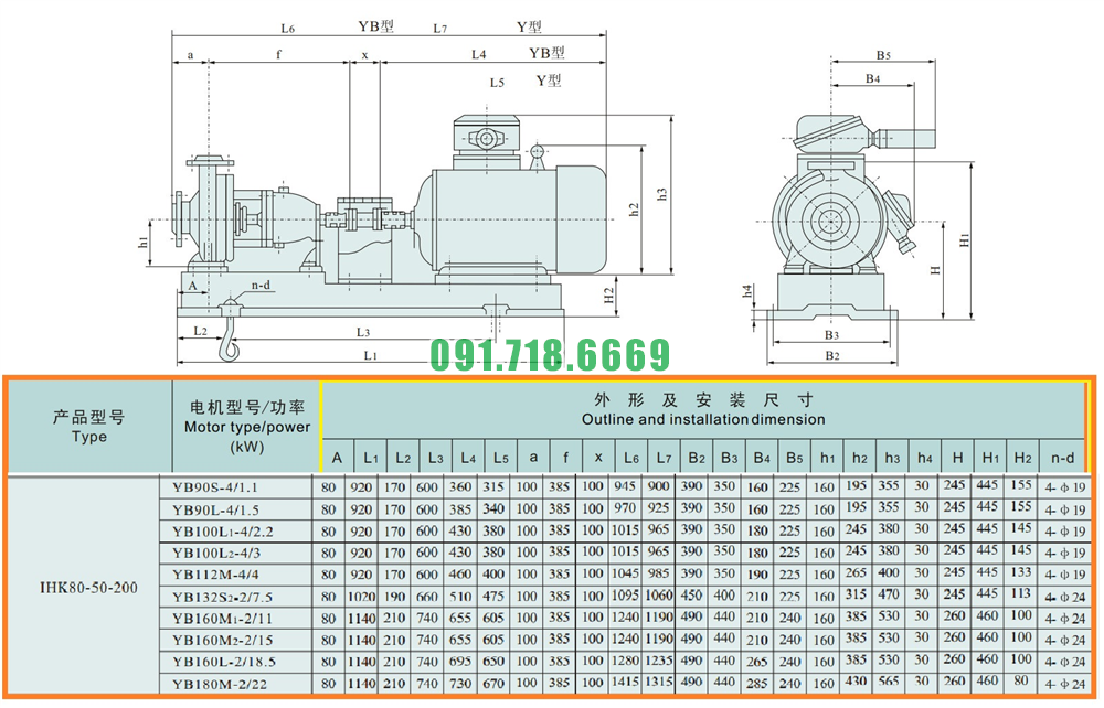 Kích thước của đầu máy bơm nước li tâm trục ngang cánh hở IHK80-50-200 có điện áp 380v