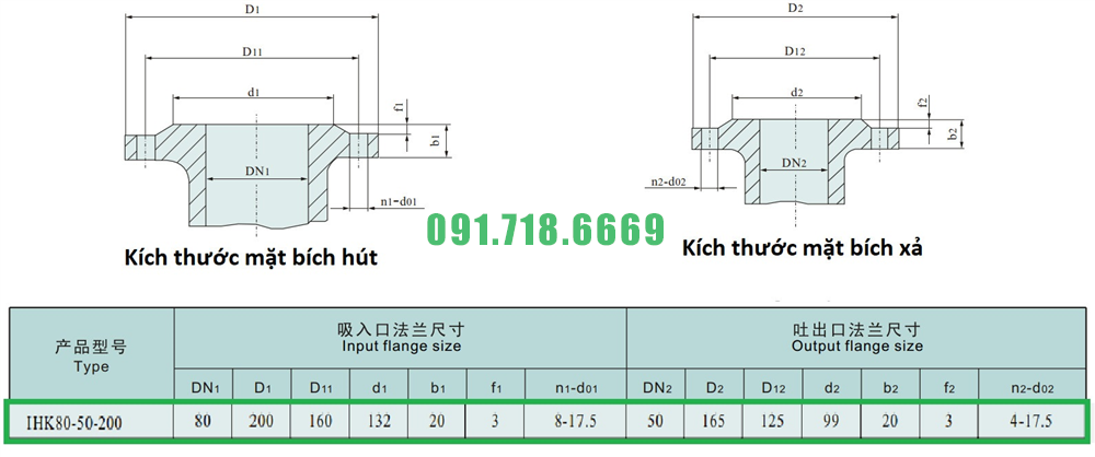 Kích thước mặt bích của máy bơm nước li tâm trục ngang cánh hở IHK80-50-200 có điện áp 380v