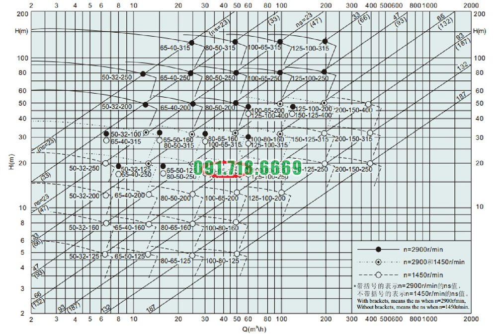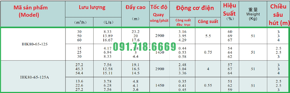Bảng lưu lượng của máy bơm nước li tâm trục ngang cánh hở IHK80-65-125 kích thước Dn80