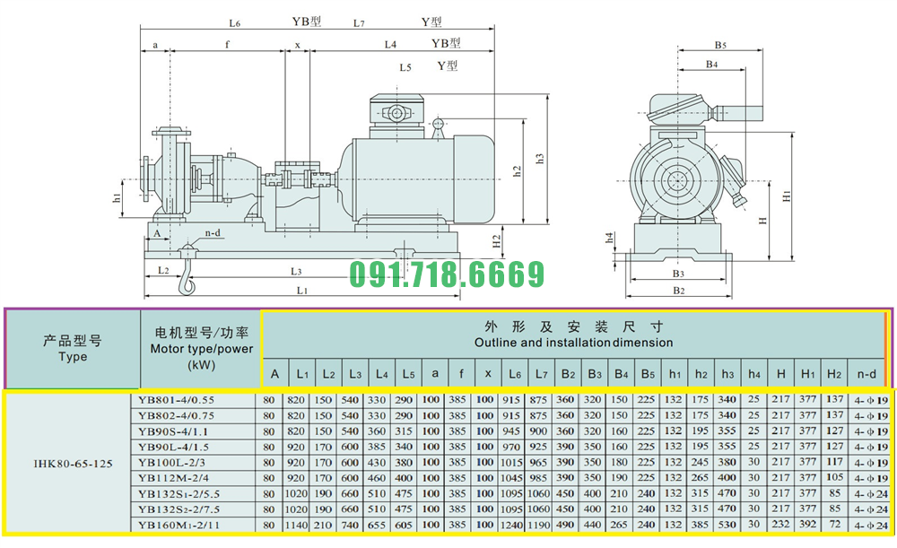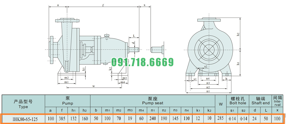 Kích thước của đầu máy bơm nước li tâm trục ngang cánh hở IHK80-65-125 kích thước Dn80