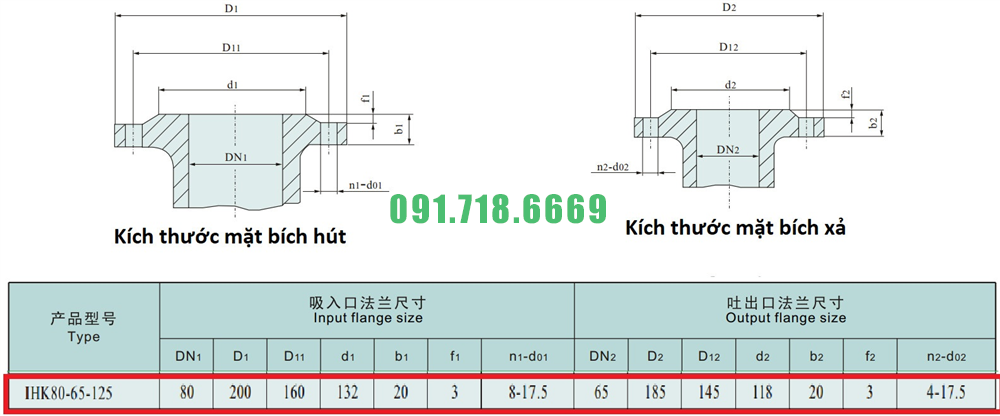 Kích thước mặt bích của máy bơm nước li tâm trục ngang cánh hở IHK80-65-125 kích thước Dn80